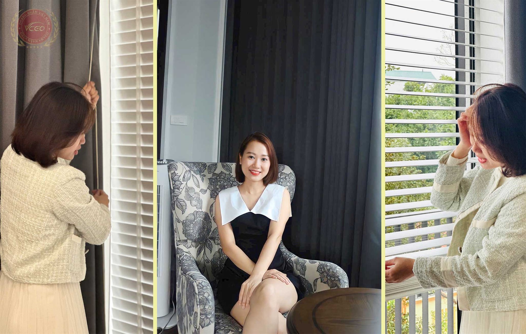 DN. Đỗ Ngọc Mến chụp ảnh bên các sản phẩm rèm cửa cao cấp do bên công ty chị thiết kế và thi công.