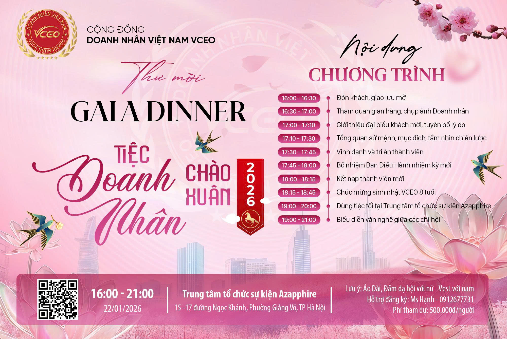 Gala Dinner – Tiệc Doanh Nhân Chào Xuân 2026 là dịp để mỗi thành viên cùng nhìn lại hành trình đã qua, trân trọng những giá trị đang có và sẵn sàng bứt phá trong năm mới với tinh thần kết nối mạnh mẽ hơn, tầm nhìn xa hơn và khát vọng lớn hơn.