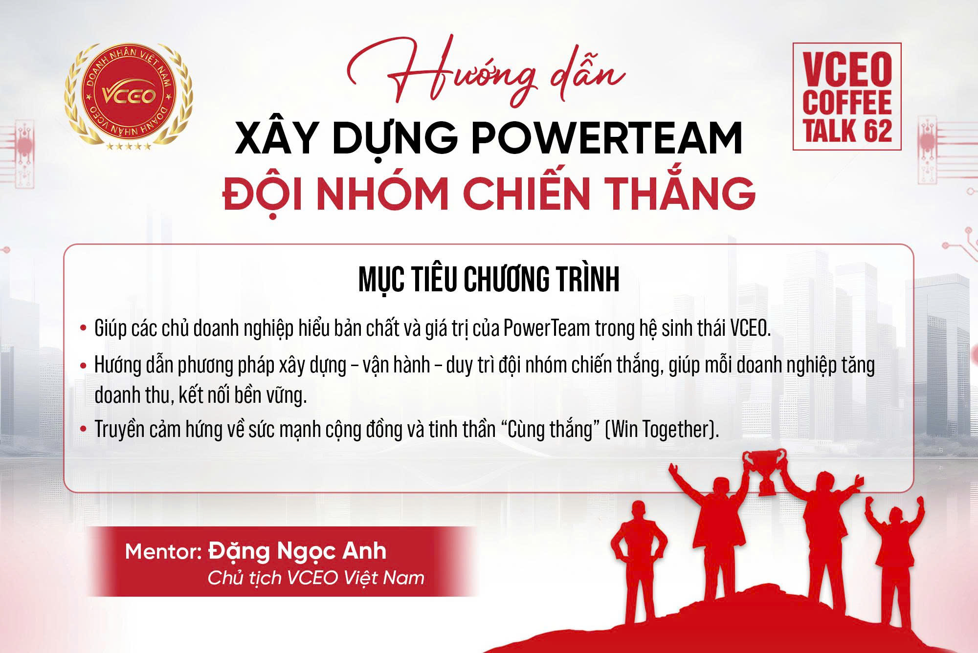 Trong buổi Coffee Talk lần này, chúng ta sẽ cùng nhau khám phá những bí quyết xây dựng và phát triển đội nhóm mạnh mẽ, hiệu quả, từ đó tạo nên sức mạnh tổng hợp giúp doanh nghiệp và cá nhân phát triển vượt bậc. Các thành viên VCEO sẽ được chia sẻ các phương pháp thực tiễn, kỹ năng lãnh đạo và quản lý đội nhóm, cũng như cách tạo động lực và gắn kết thành viên trong Powerteam.